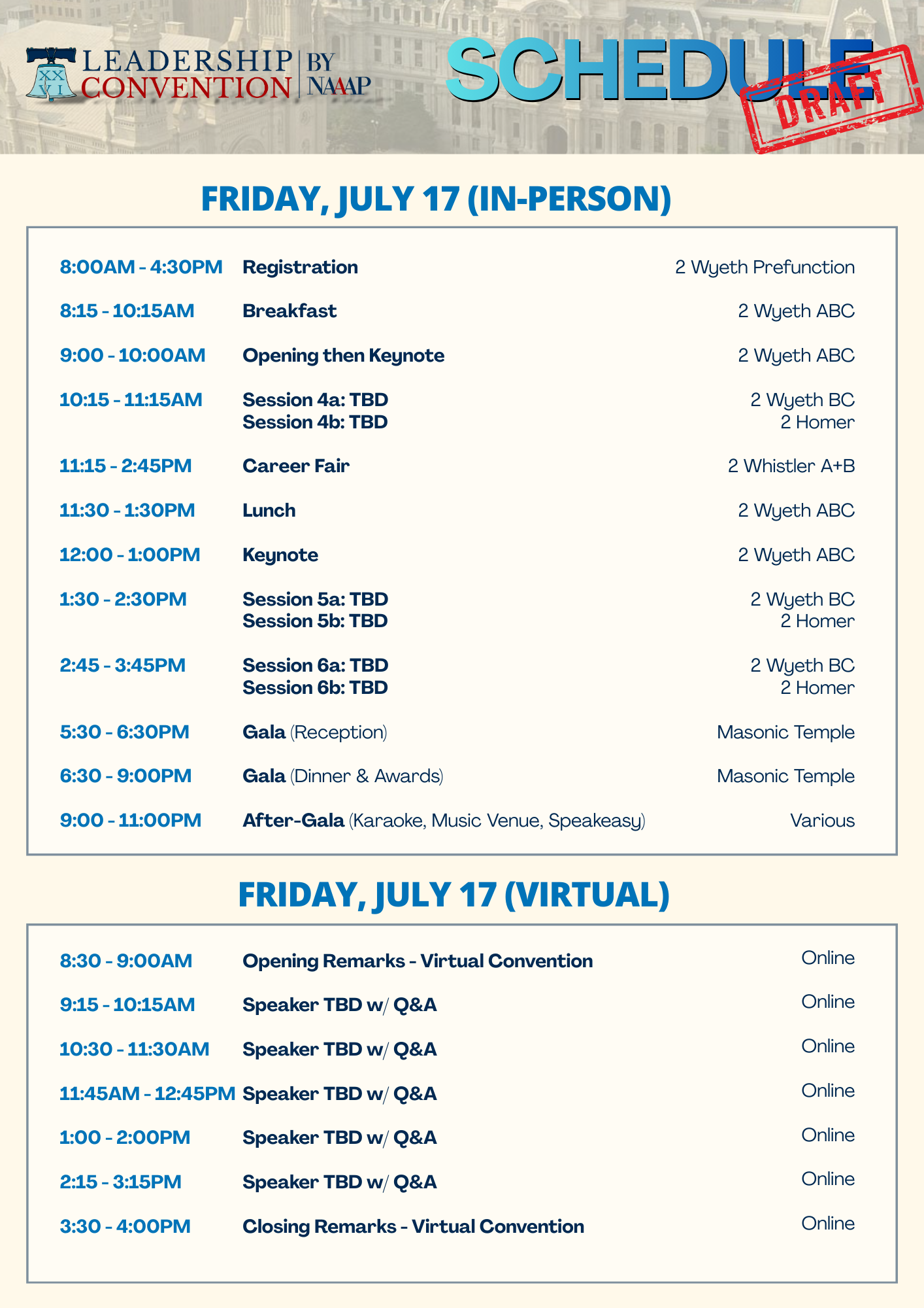 Registration will open on Friday, February 27, with free Career Fair, discounted Convention tickets for NAAAP leaders and select partner organizations, and a la carte tickets for Thursday Welcome Reception, Friday Unity Gala, and Saturday NAAAP Banquet. With a smaller capacity venue, this convention is expected to sell out, so consider making plans now. We hope to see you in Philly!